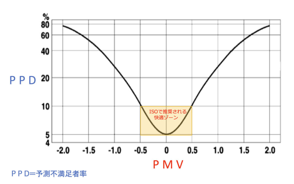 国際規格(ISO 7730)では、このPMVが「-0.5 ~ +0.5」の範囲に収まることが推奨されています。