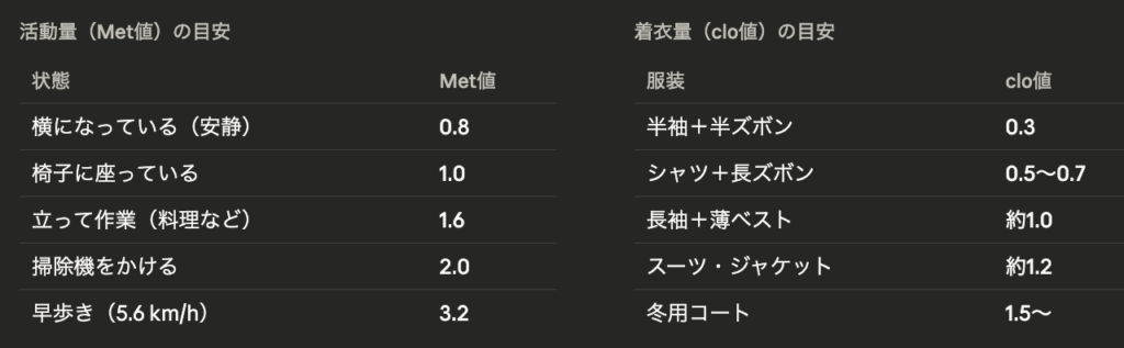PMVの6つの要素のうち、「空気温度(室温)」、「平均放射温度」、「相対湿度」、「気流速度」は設計段階で対策が可能ですが、残りの2つ、「着衣量」と「代謝量(活動量)」は人それぞれの要素となります。