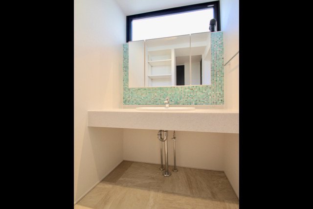 造作でワンオフ製作した洗面化粧台。グリーン系のモザイクタイルが爽やかな空間を演出しています。
