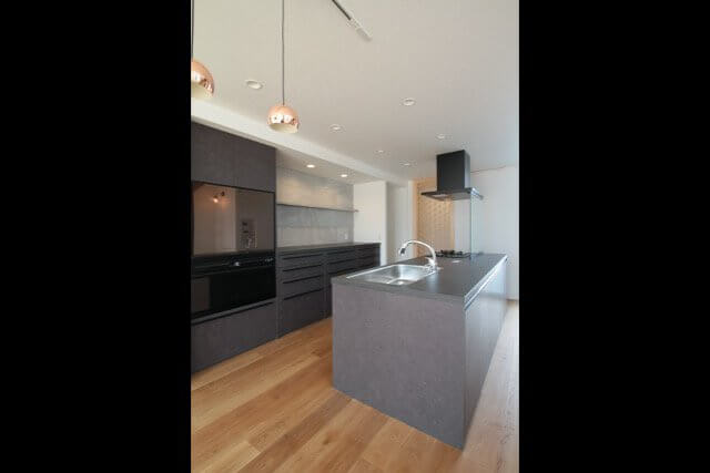 LIXIL社の最上級システムキッチン。広々としたアイランド型のシステムキッチンと、充実機能のバックカウンター収納システム。