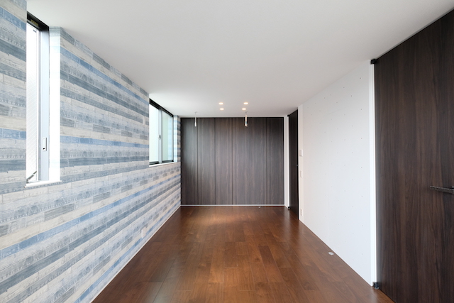 将来間仕切ることも想定したワンルームの子供部屋。 アクセントクロスが鮮やかな空間です。
